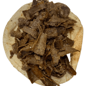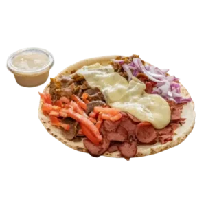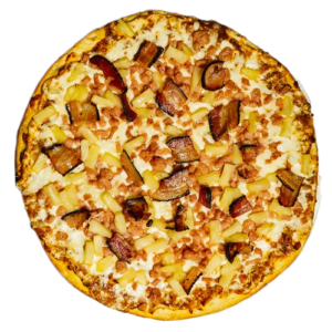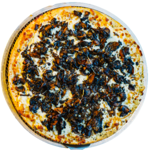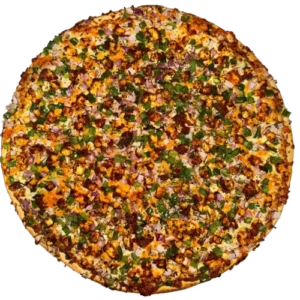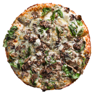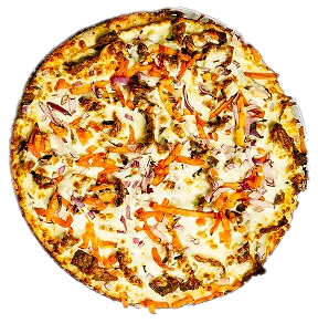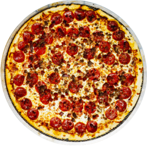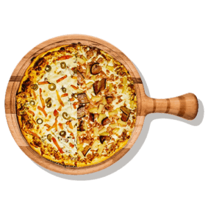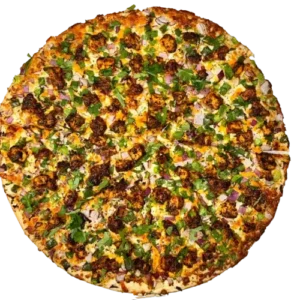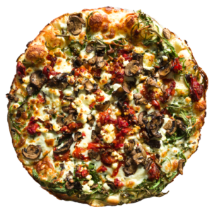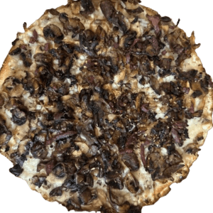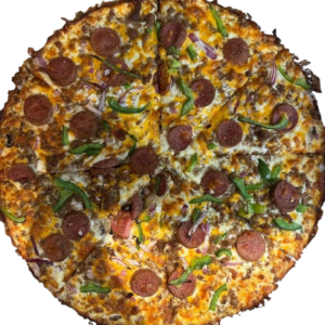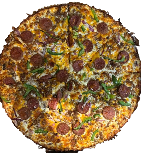 Persian pizza sauce, ground beef, Persian beef sausage, mushrooms, green pepper, onion, mozzarella, cheddar, and herbs