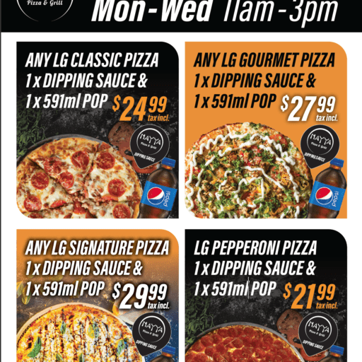 Enjoy our exclusive Lunch Specials available Monday to Friday from 11 AM to 3 PM. These deals can only be ordered in-store, so stop by your nearest Nayya Pizza & Grill location to grab a delicious meal at a great price!