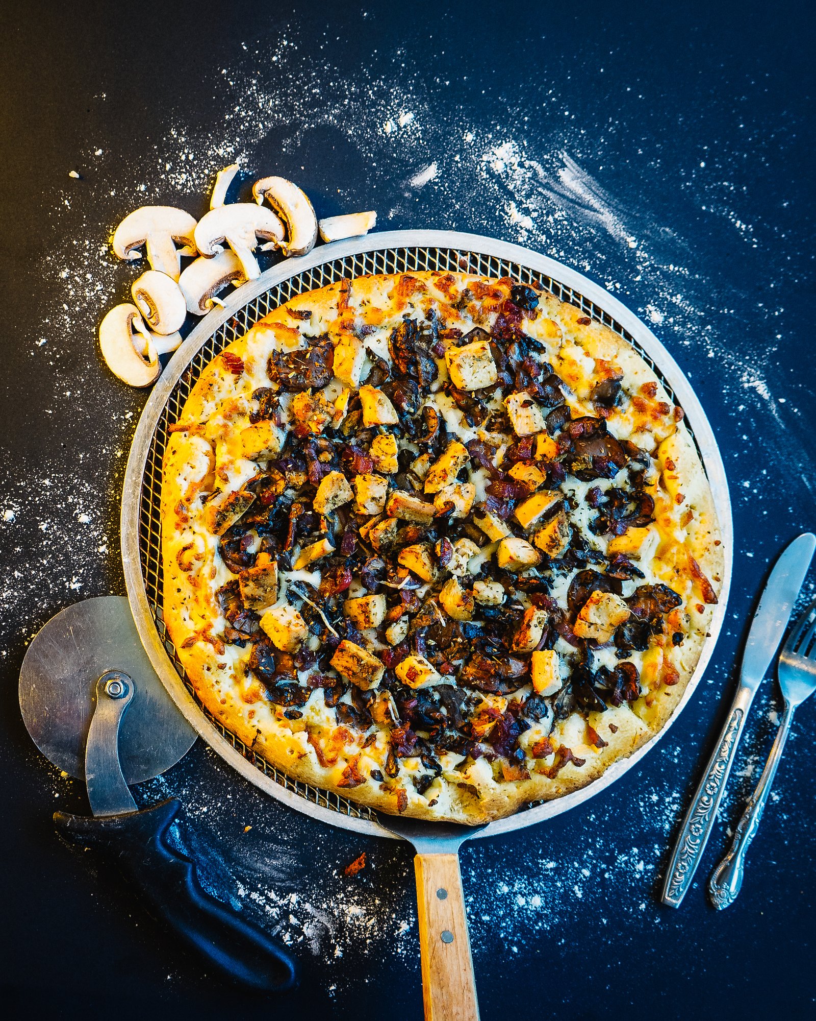 Garlic sauce, mozzarella, chicken, sautéed mushrooms, roasted garlic, caramelized onions, Romano & herbs.