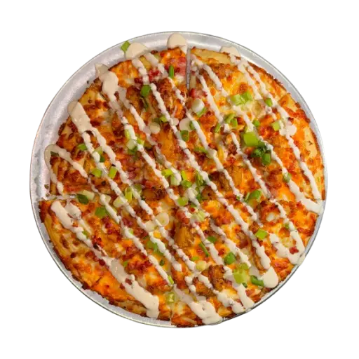 Ranch sauce, crispy chicken strips, mozzarella, bacon, cheddar cheese, green onions and a drizzle of ranch.