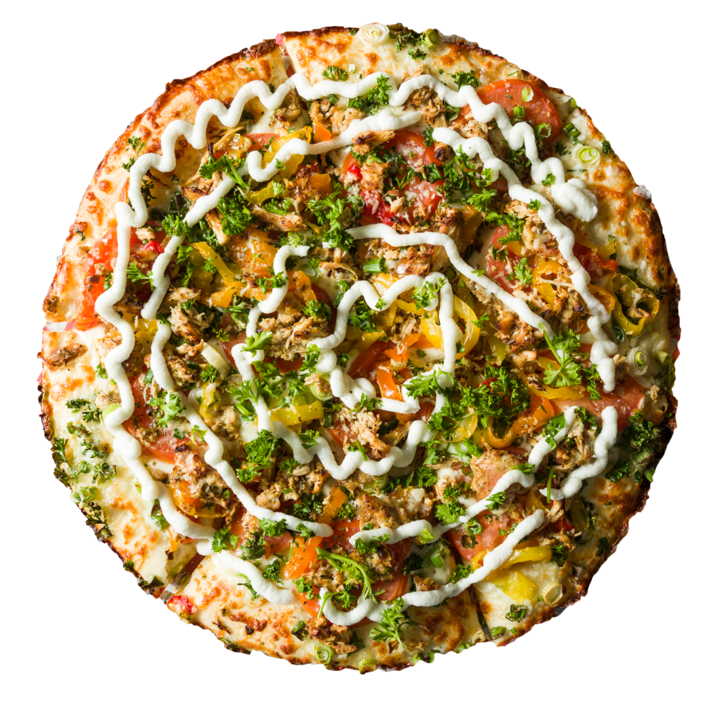 Garlic sauce, mozzarella, sliced tomatoes chicken shawarma, parsley, green onions, banana peppers & garlic sauce on top.