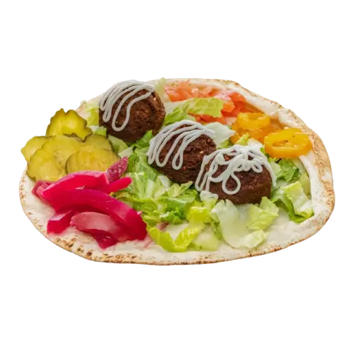 Falafel, tomato, lettuce, pickle, pickled turnip, hot pepper & garlic sauce (On 9″ pita bread).