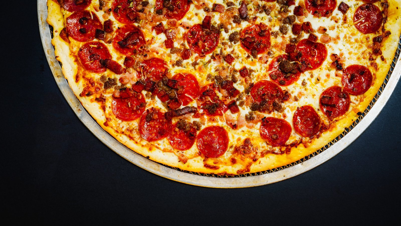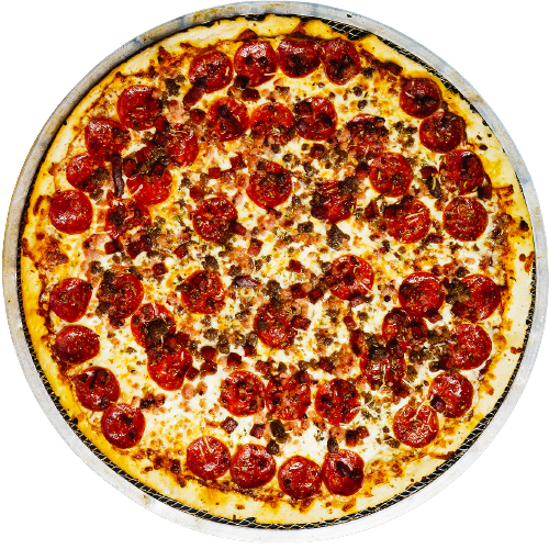 Neapolitan sauce with hot brothers pepperoni under the cheese, pepperoni & ham above the cheese, smoked bacon, Romano, chili flakes & herbs & Stingin’ Hot Honey after it’s cooked.