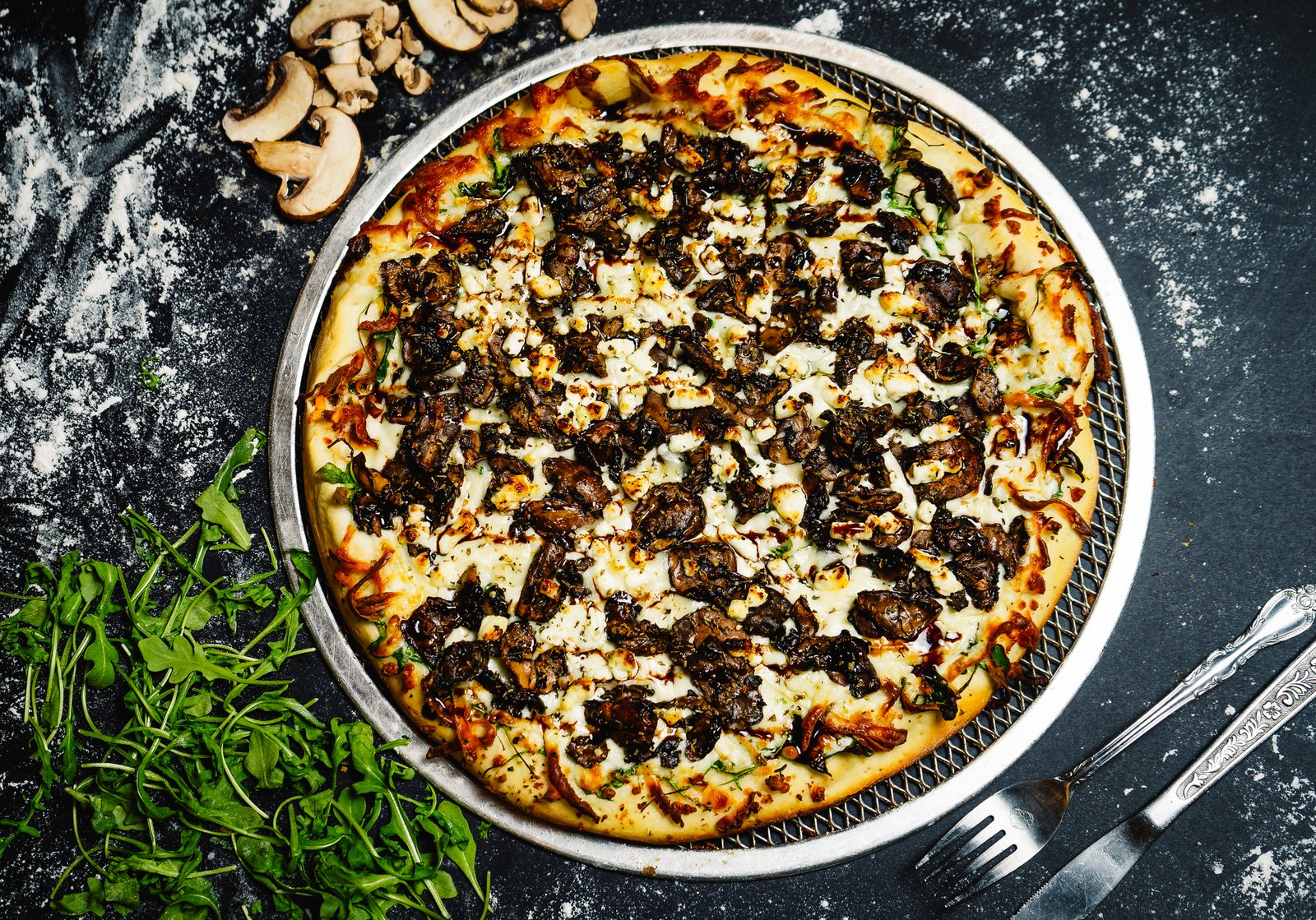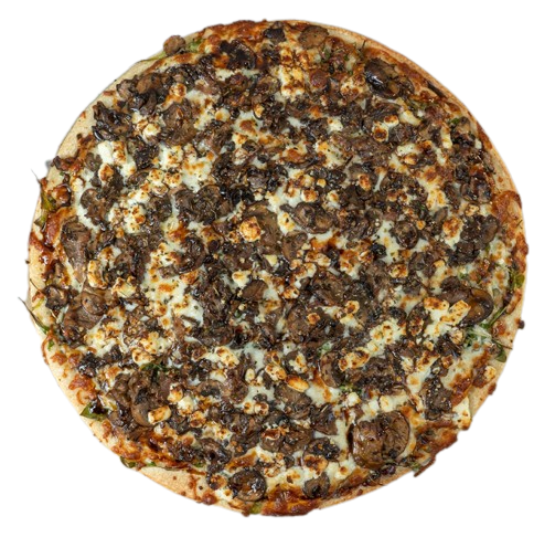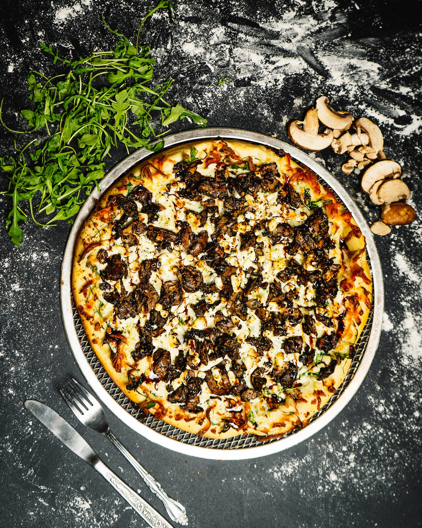 olive oil, mozzarella, sautéed mushroom, onions sautéed with rosemary, roasted garlic, goat cheese, arugula, herbs & balsamic reduction.