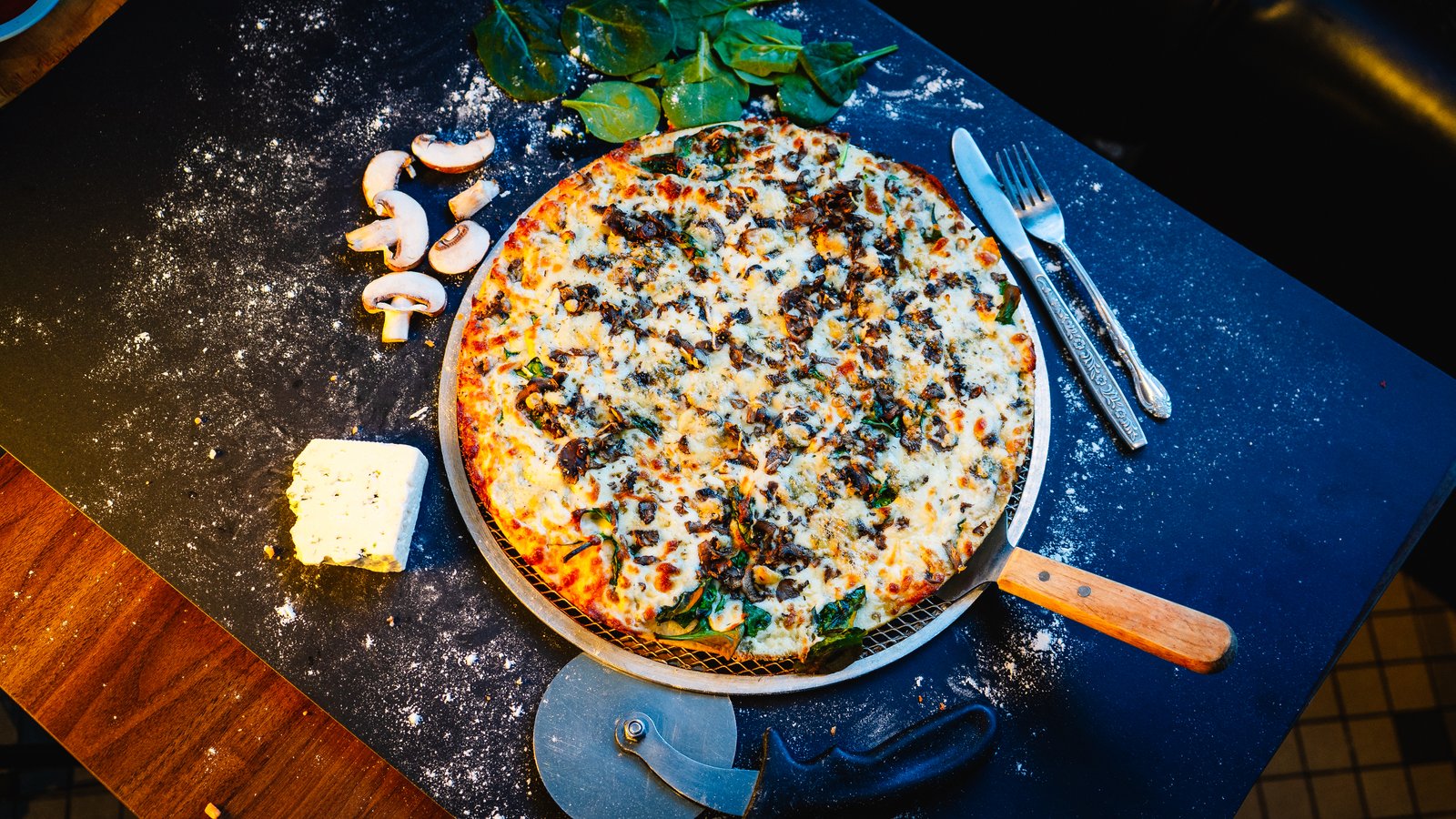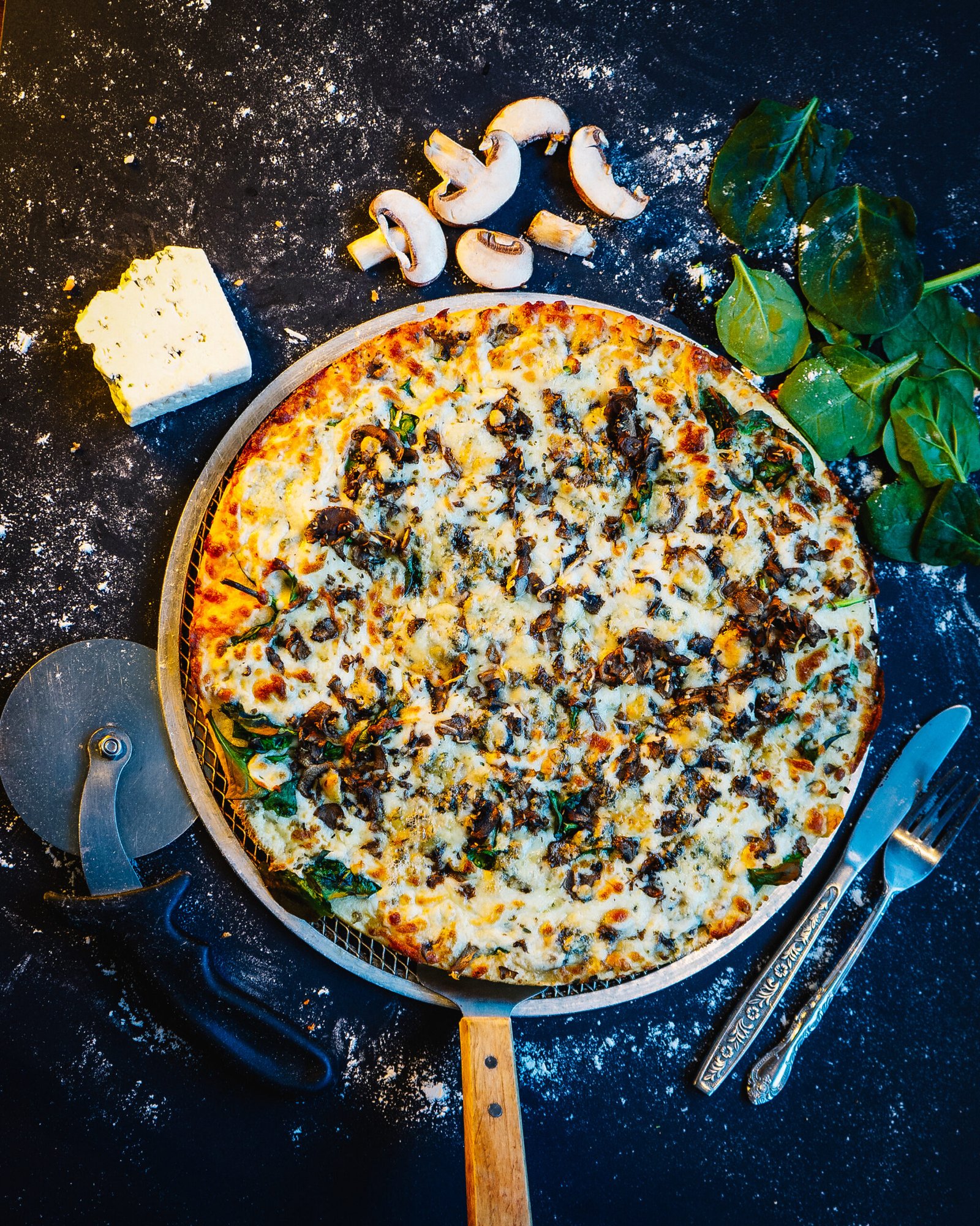 Light garlic sauce, spinach, white mushrooms, mozzarella, Gorgonzola & Pecorino Romano.