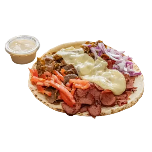 With brothers hot pepperoni, cheese, onions, tomatoes, and donair sauce on the side.