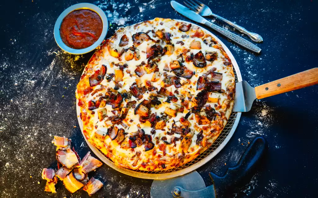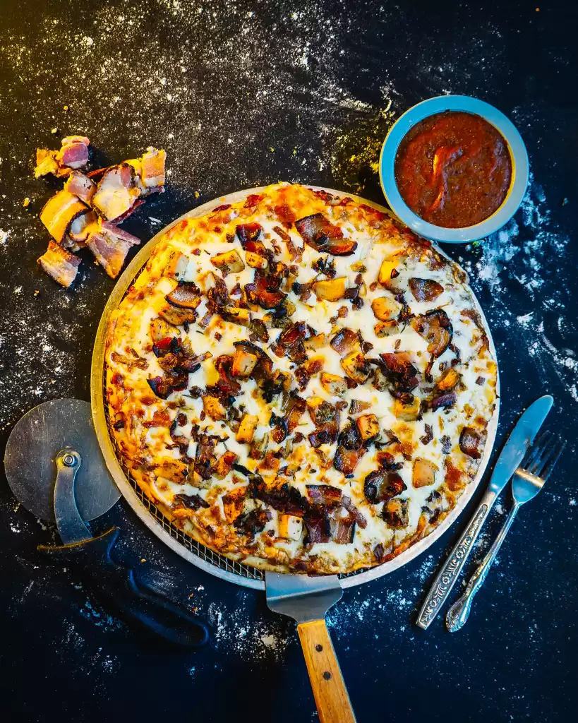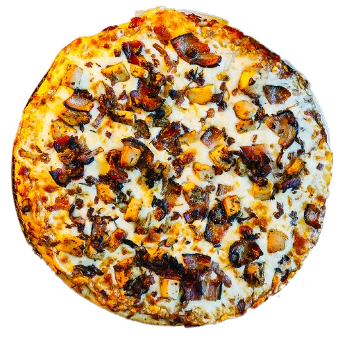 Pictou county style sauce, mozzarella, chicken, smoked bacon, sautéed onion with rosemary, extra virgin olive oil