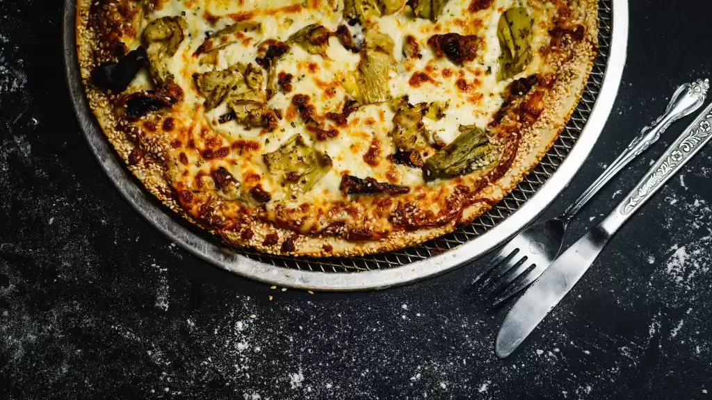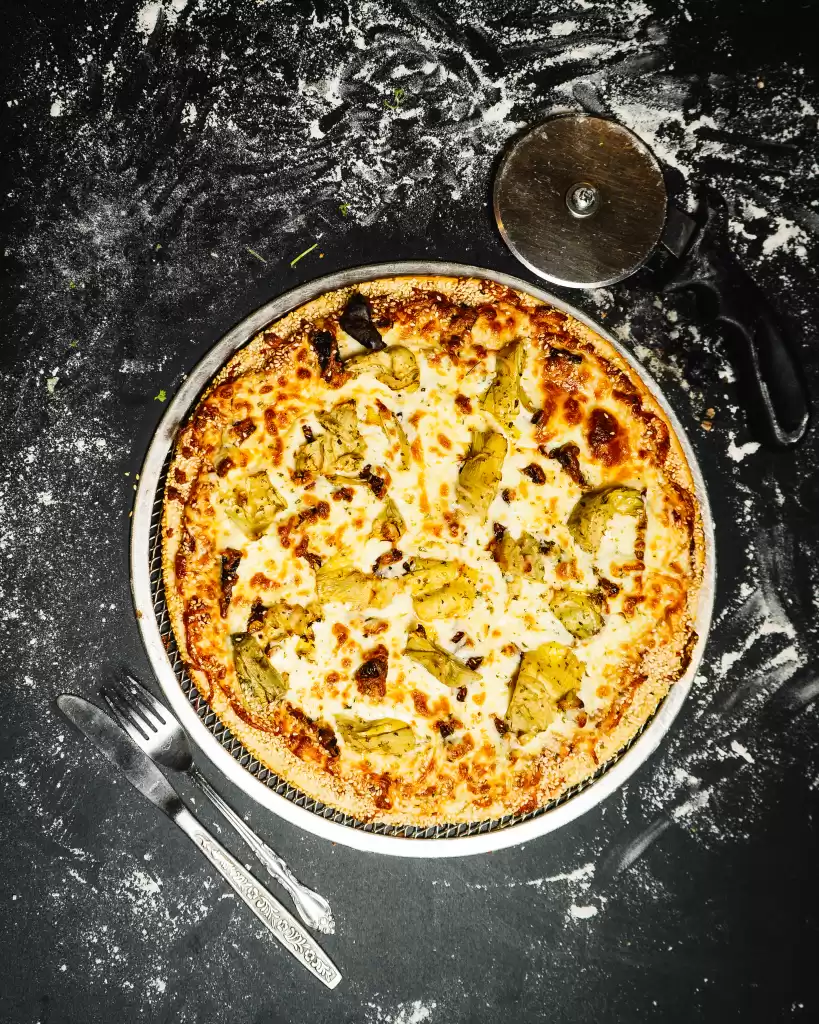 Sesame seed crust, Neapolitan sauce, mozzarella, sun-dried tomatoes, artichoke hearts, Romano, Parmigianino, black pepper, extra virgin olive oil & garlic.