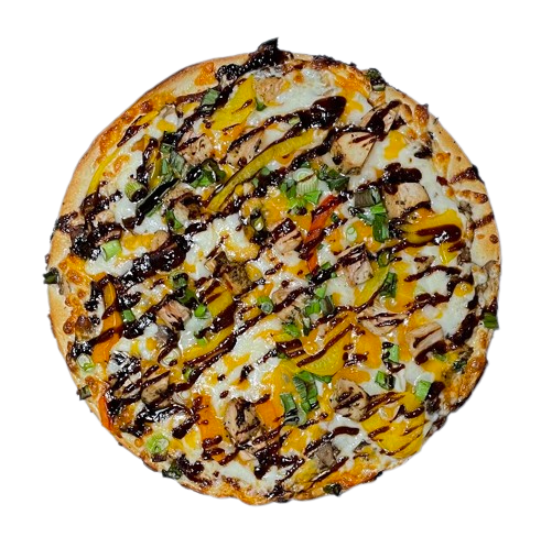 Smoky BBQ and Neapolitan pizza sauce, mozzarella, chicken breast, cheddar, mushrooms, green onions & bell peppers.