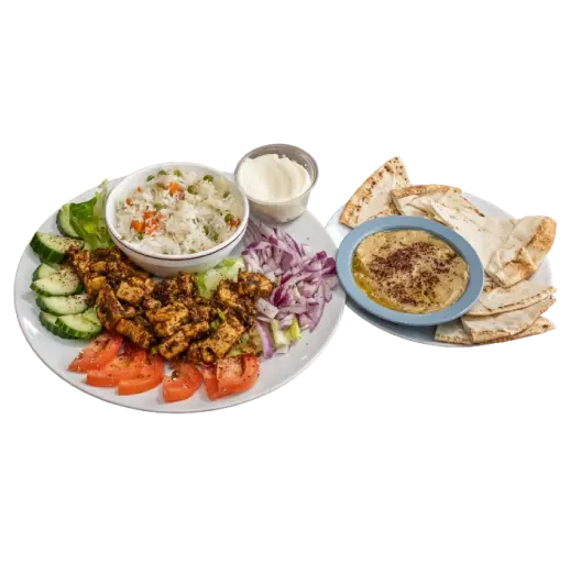 Include Mediterranean salad, hummus,basmati rice, pita & garlic sauce.