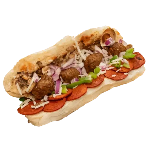 Vegan pepperoni, vegan meatball, vegan ground beef, onions, green peppers, mushrooms, vegan cheese.