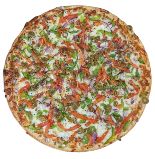 Neapolitan pizza sauce, mushrooms, mozzarella, fresh tomatoes, onions, green pepper, green olives, parmesan, olive oil, fresh garlic & herbs.